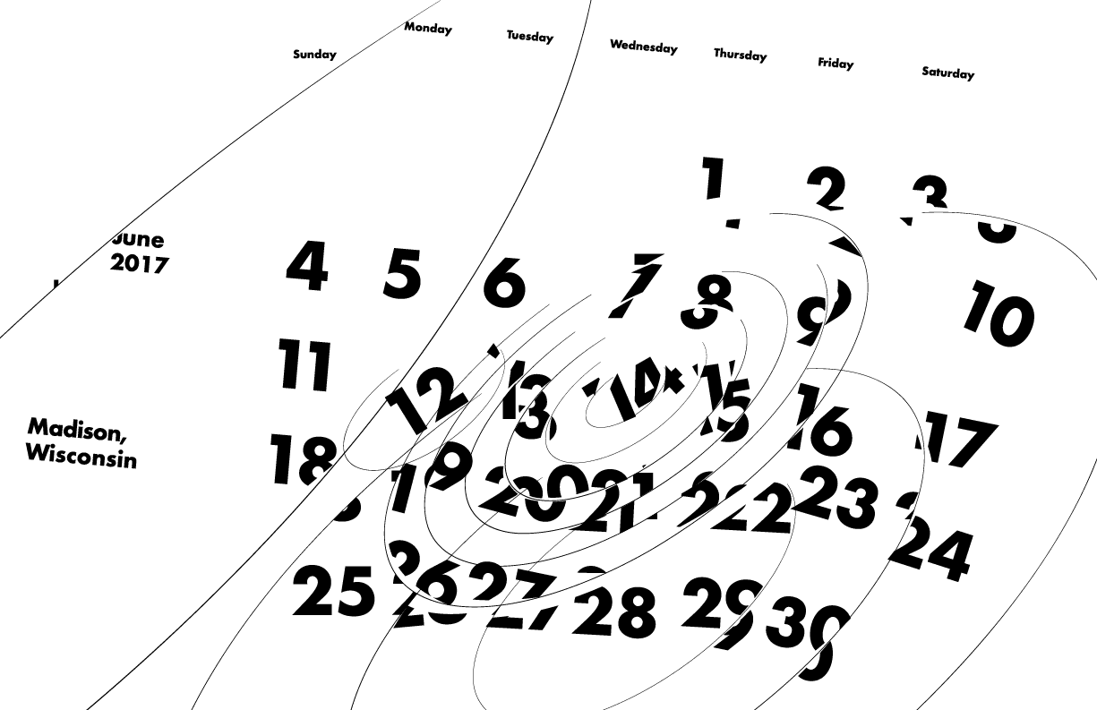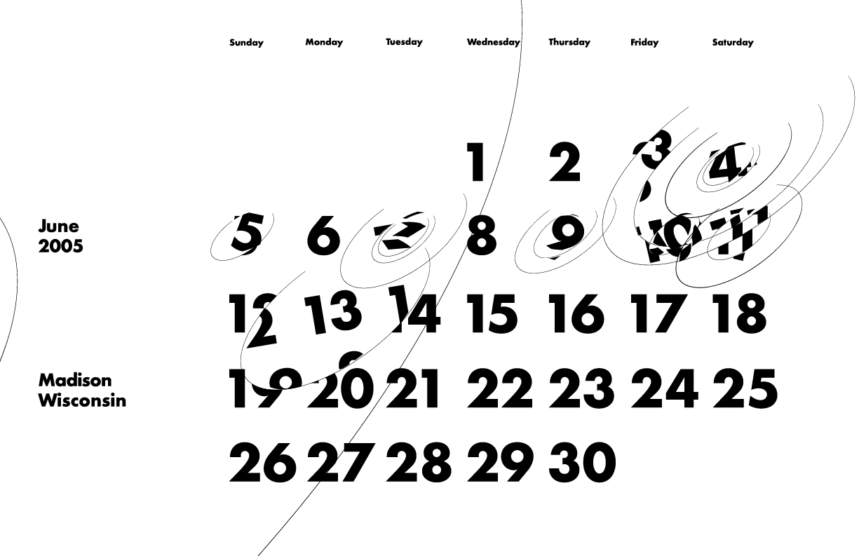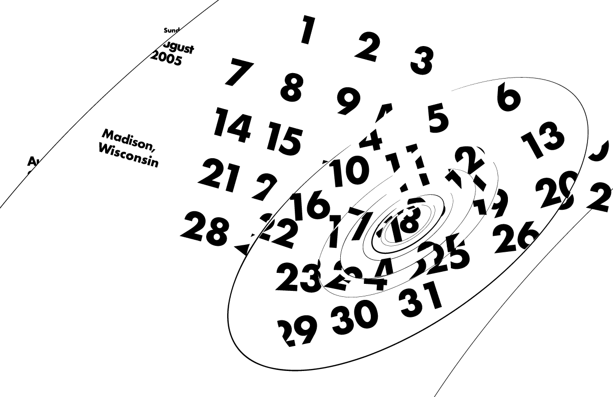 My calendar was designed to communicate the number, size, strength, duration and destruction of tornados in Wisconsin on specific days. Each sphere surrounding a day on the calendar is showing the number of tornados. The size of a sphere is based on the size of the tornado. The weight of the line is based on the strength of the tornado. The length of the line is based on the duration of the tornado.